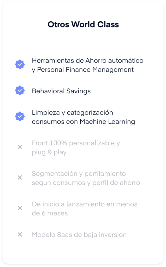 Conocemos la realidad latinoamericana y, como PFM as a service, hemos integrado nuestra herramienta exitosamente con diferentes instituciones financieras. Te acompañaremos durante todo el viaje de integración, siendo tus compañeros y traductores para que los técnicos de tu banco no te vendan la pomada. No todo será de color rosa, pero estaremos a tu lado para proponerte siempre una solución e implementar cambios rápidos para que siempre tengas todo bajo control.