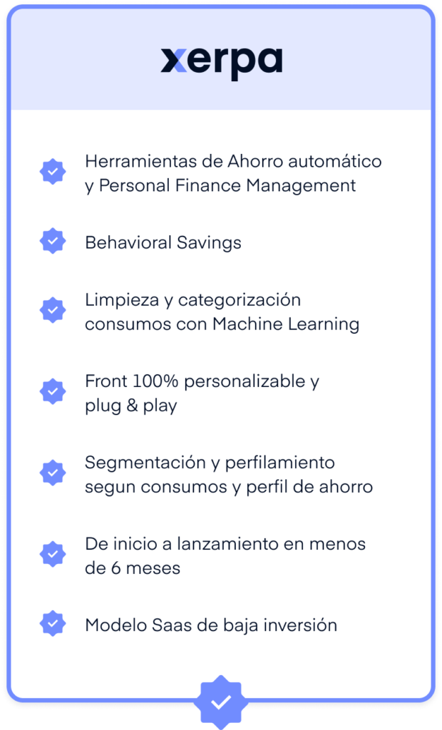getxerpa desarrolla herramientas marca blanca y fáciles de integrar, que ayudan a tus clientes a gastar mejor y ahorrar más, convirtiéndote en su banco principal.